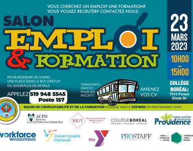 Le Centre communautaire francophone Windsor-Essex-Kent (CCFWEK) annonce la tenue d’un Salon sur l’Employabilité et la formation, le 23 mars de cette année, 2023. Organisée dans le.